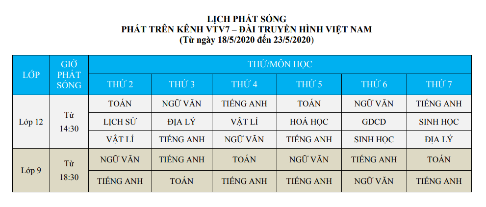 Lịch phát sóng dạy học trên truyền hình VTV7 (Từ ngày 18/5 đến 23/5/2020)