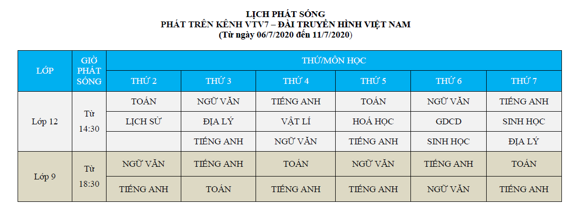 Lịch phát sóng dạy học trên truyền hình VTV7 (Từ ngày 06/7 đến 11/7/2020)