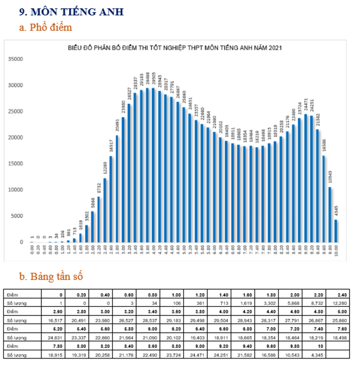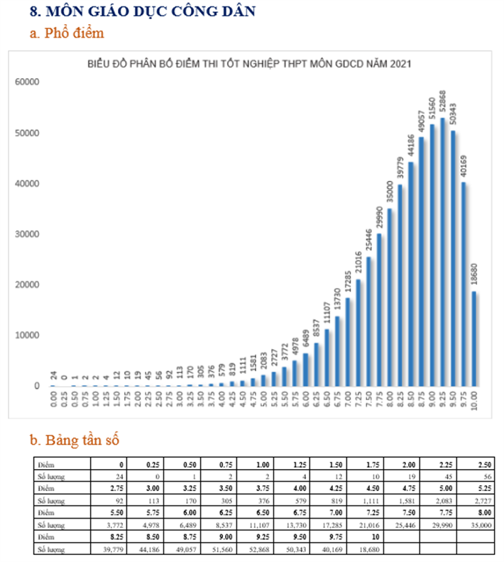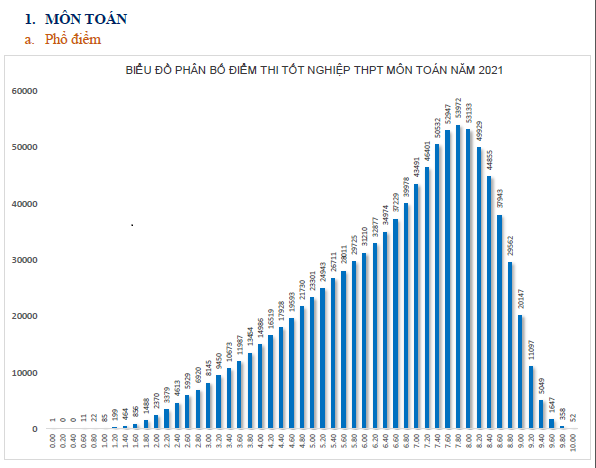 Thứ hai, 26/07/2021 | 00:00 A- A A+ | Phân tích phổ điểm các môn thi Kỳ thi tốt nghiệp THPT năm 2021 Tập tin đính kèm Xem Bộ Giáo dục và Đào tạo công bố kết quả phân tích phổ điểm thi các môn thi Kỳ thi tốt nghiệp THPT năm 2021. Nội dung chi tiết trong file đính kèm./. moet.gov.vn Tài liệu đính kèm 201f6b3593d16d8d87594690fa78292d2021_BaoCao_Phodiem_Final.pdf Xem trước Tải về Tin cùng chuyên mục Phân tích phổ điểm thi THPT năm 2021 của một số khối thi Phân tích phổ điểm các môn thi Kỳ thi tốt nghiệp THPT năm 2021 Hỗ trợ giáo viên nâng cao năng lực chuyển đổi số Hướng dẫn triển khai chương trình giáo dục trung học năm học 2021-2022 Học sinh Việt Nam đoạt giải Ba Hội thi Khoa học Kỹ thuật quốc tế 2021 7 dự án của học sinh Việt Nam tham gia Hội thi Khoa học kỹ thuật quốc tế 2021 12 dự án đạt giải Nhất cuộc thi Khoa học kỹ thuật quốc gia học sinh trung học Khai mạc cuộc thi Khoa học kỹ thuật cấp quốc gia học sinh trung học năm học 2020-2021 Bộ GDĐT chỉ đạo thực hiện chương trình giáo dục và phòng chống dịch COVID-19 Bộ trưởng Bộ GDĐT phê duyệt danh mục sách giáo khoa lớp 2, lớp 6