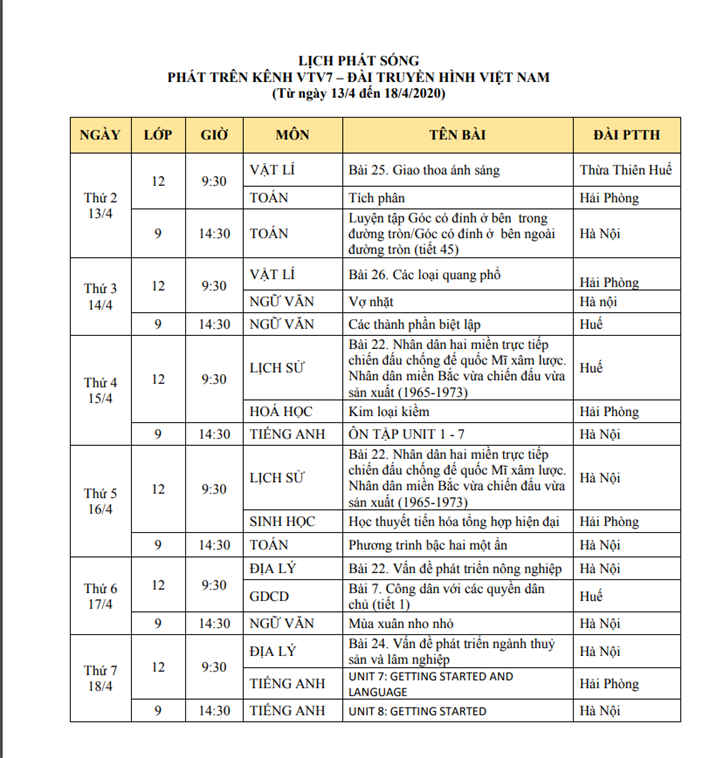 Lịch phát sóng dạy học trên truyền hình VTV7 (Từ ngày 13/4 tới 18/4/2020)