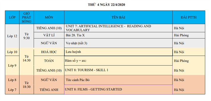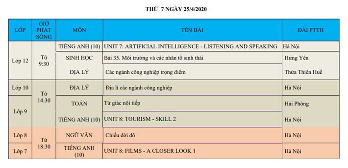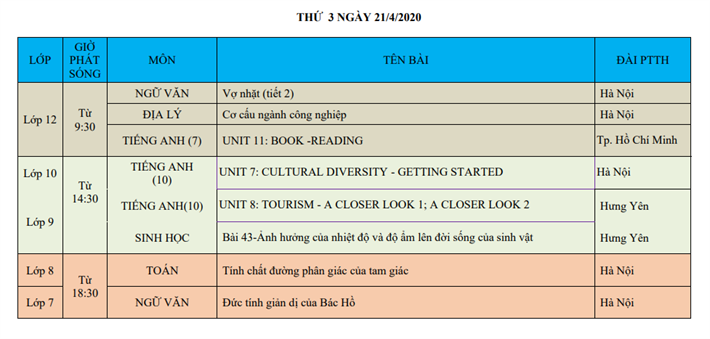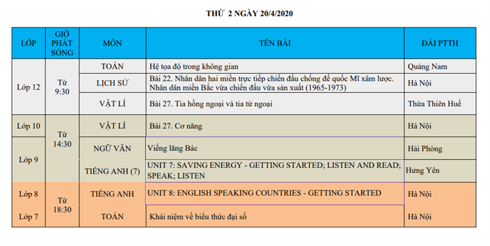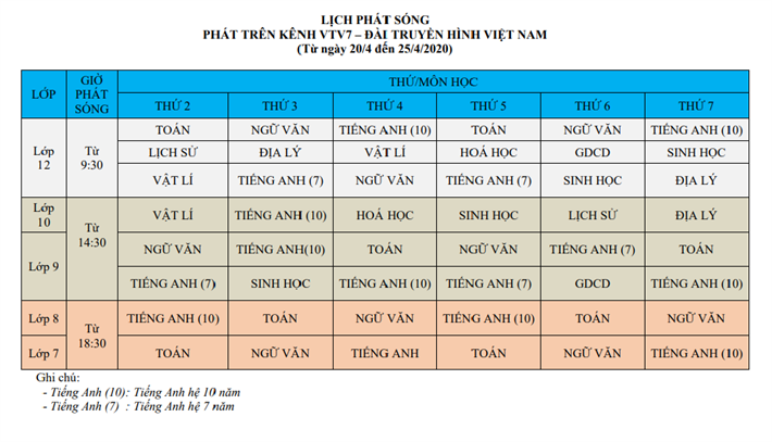 Lịch phát sóng dạy học trên truyền hình VTV7 (Từ ngày 20/4 đến 25/4/2020)