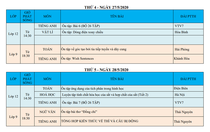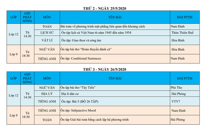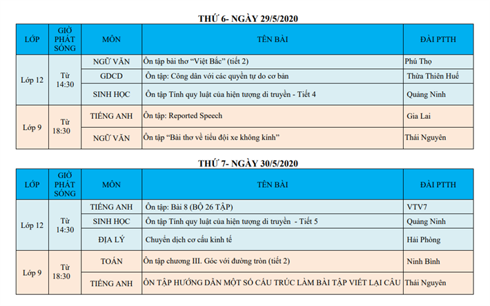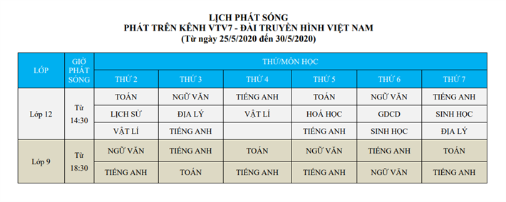 Lịch phát sóng dạy học trên truyền hình VTV7 (Từ ngày 25/5 đến 30/5/2020)