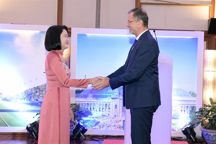 Đại sứ Cộng hoà Pháp tại Việt Nam Olivier Brochet cảm ơn và đánh giá cao những đóng góp của bà Cao Thị Hồng Nga trong mối quan hệ hợp tác giữa Pháp và Việt Nam