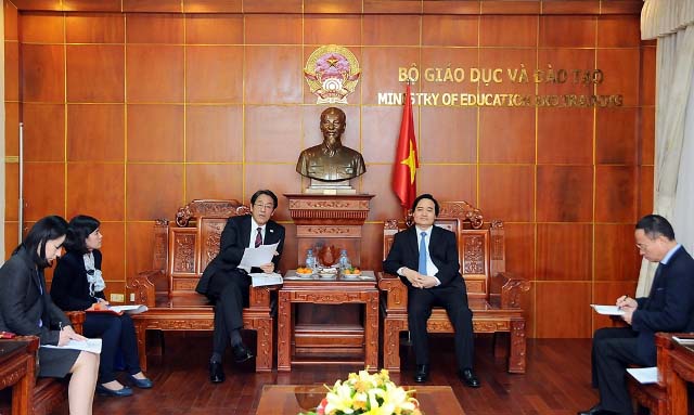 Cảm ơn ngài Đại sứ đã chia sẻ thông tin rất cởi mở có tính xây dựng để hợp tác trong lĩnh vực GD&ĐT giữa 2 quốc gia phát triển bền vững cũng như thiện chí hỗ trợ qua số công ty cho các trường học ở Việt Nam của Chính phủ Nhật Bản, Bộ trưởng cho biết ông hy vọng những chương trình có ý nghĩa như thế này sẽ tiếp tục trong tương lai.