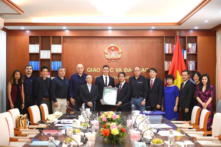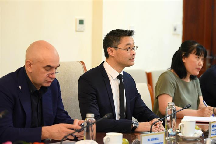 Tiến sĩ Philipp Rosler, nguyên Phó Thủ tướng Đức, Lãnh sự danh dự của Việt Nam tại Thụy Sĩ (giữa) bày tỏ vui mừng được đến thăm, làm việc tại Bộ GDĐT Việt Nam
