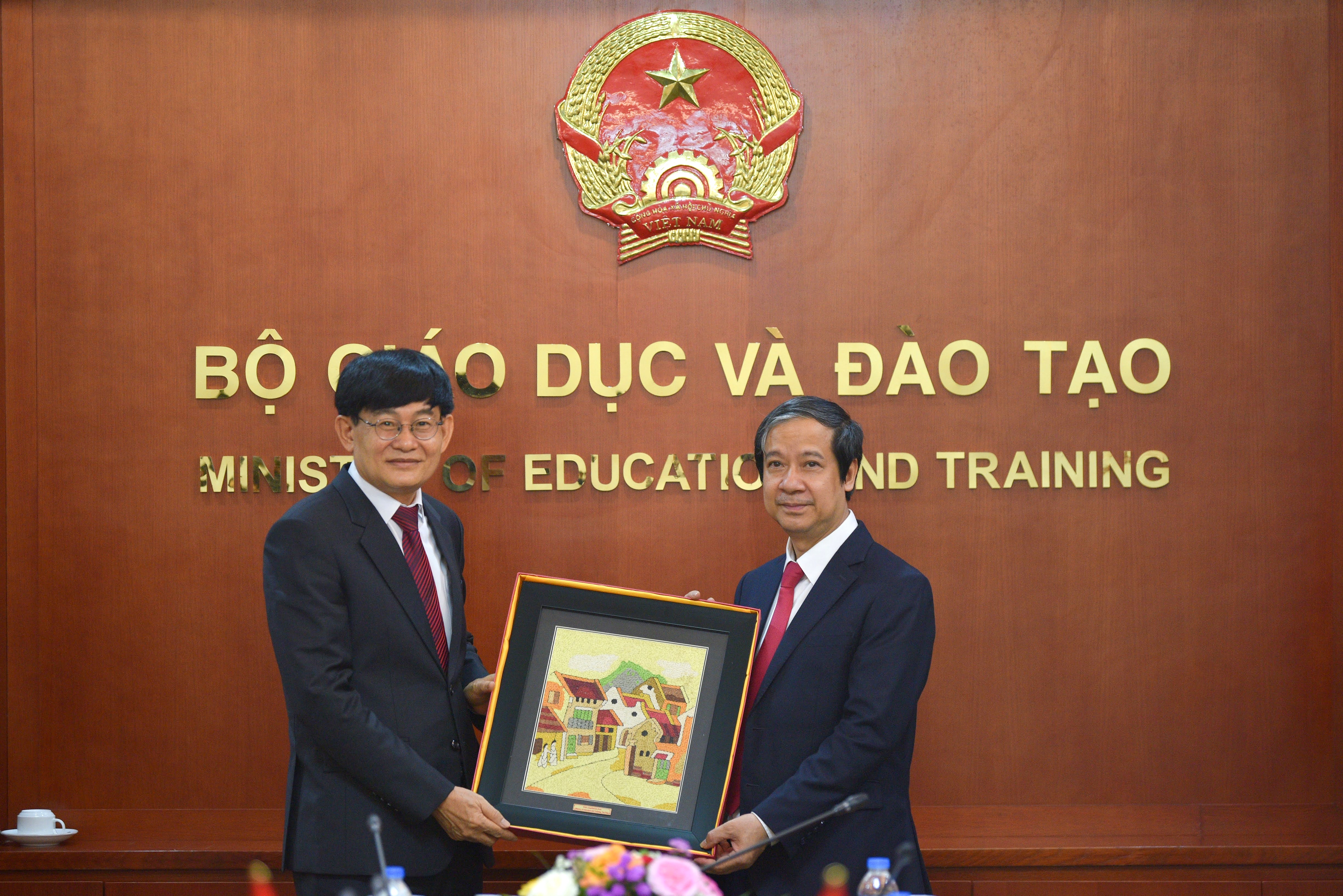 Bộ trưởng Nguyễn Kim Sơn tặng quà lưu niệm Bộ trưởng Bộ Giáo dục và Thể thao Lào Phút-Sim-ma-la-vông