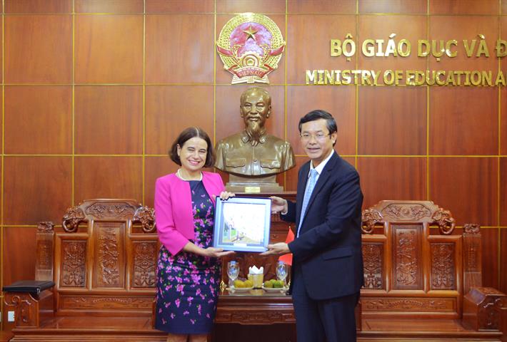 Chúc mừng bà Robyn Mudie kết thúc nhiệm kỳ thành công tại Việt Nam, Thứ trưởng Nguyễn Văn Phúc cảm ơn Đại sứ đã luôn quan tâm, hỗ trợ Bộ GDĐT cùng các cơ quan Việt Nam trong thực hiện chương trình, dự án hợp tác về giáo dục, trong đó có chương trình Aus4Skills.