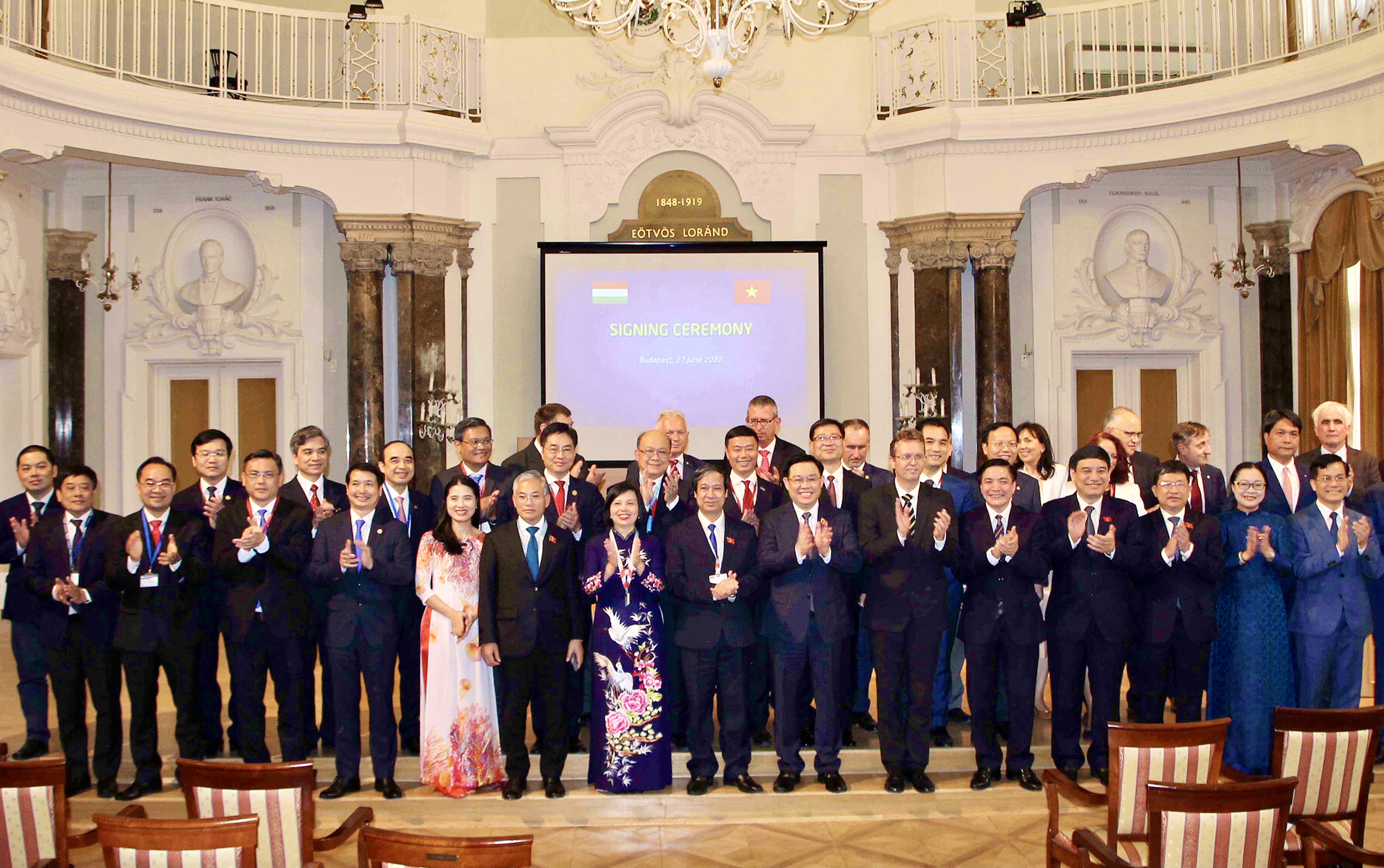 Cùng dự có Phó Thủ tướng Chính phủ Lê Văn Thành, Bộ trưởng Bộ Giáo dục và Đào tạo Nguyễn Kim Sơn; Tổng Thư ký Quốc hội; Chủ nhiệm Văn phòng Quốc hội Bùi Văn Cường; Chủ nhiệm Uỷ ban Đối ngoại của Quốc hội Vũ Hải Hà; Chủ nhiệm Uỷ ban Văn hoá và Giáo dục của Quốc hội Nguyễn Đắc Vinh; Thứ trưởng Bộ Ngoại giao Hà Kim Ngọc; Đại sứ Việt Nam tại Hungary Nguyễn Thị Bích Thảo. Về phía Hungary có ông ông Balazs Hanko, Quốc vụ khanh Bộ Văn hóa và Đổi mới Hunggary; ông László Borhy, Chủ tịch Hiệp hội các trường đại học, cao đẳng Hungary.
