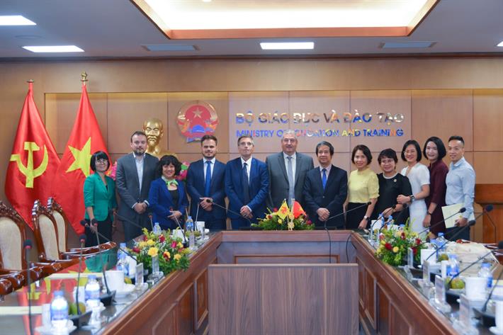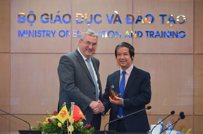 Chào mừng ngài Bộ trưởng - Thủ hiến Pierre-Yves Jeholet và đoàn công tác đến Việt Nam và đến thăm chính thức Bộ GDĐT Việt Nam, Bộ trưởng Nguyễn Kim Sơn bày tỏ vui mừng sau 5 năm, kể từ năm 2017 đến nay, Bộ GDĐT Việt Nam mới lại được đón nhà lãnh đạo cao nhất của Chính phủ Cộng đồng người Bỉ nói tiếng Pháp và Vùng Waolloni-Bruxelles đến thăm và làm việc.