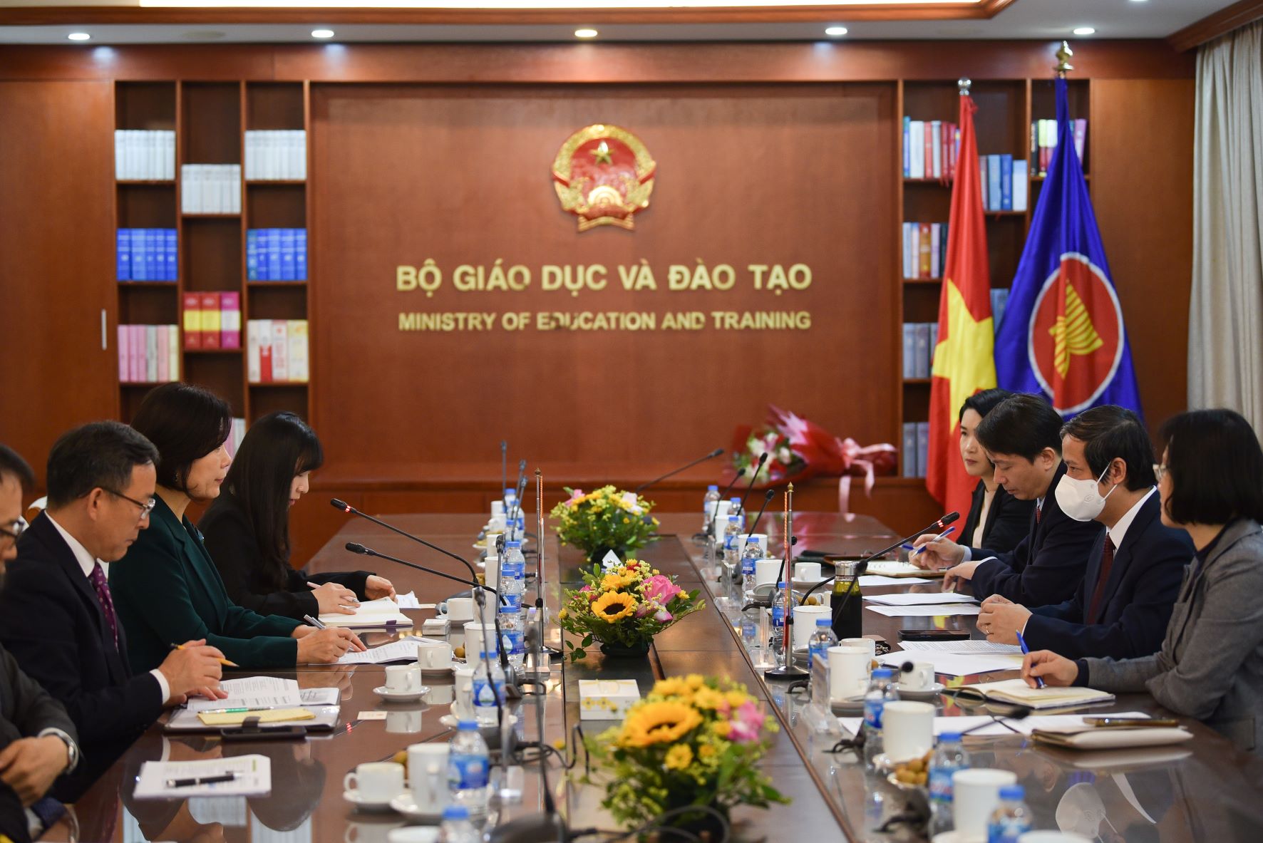 Đánh giá cao sự phối hợp hiệu quả của phía Hàn Quốc trong triển khai thực hiện   thoả thuận dạy thí điểm tiếng Hàn tại các trường phổ thông Việt Nam (hiệu lực đến hết năm học 2023-2024), Bộ trưởng đề nghị phía Hàn Quốc tiếp tục hỗ trợ trong việc biên soạn sách giáo khoa, hỗ trợ cử giáo viên tình nguyện đến các trường phổ thông theo thỏa thuận hai bên đã ký. Đồng thời, trong năm 2023, có thể xem xét việc ký kết thoả thuận mới với các nội dung bổ sung như: hỗ trợ giáo viên bản ngữ, tập huấn giáo viên, xây dựng học liệu, trao đổi văn hoá, giao lưu kết nghĩa giữa các trường phổ thông.