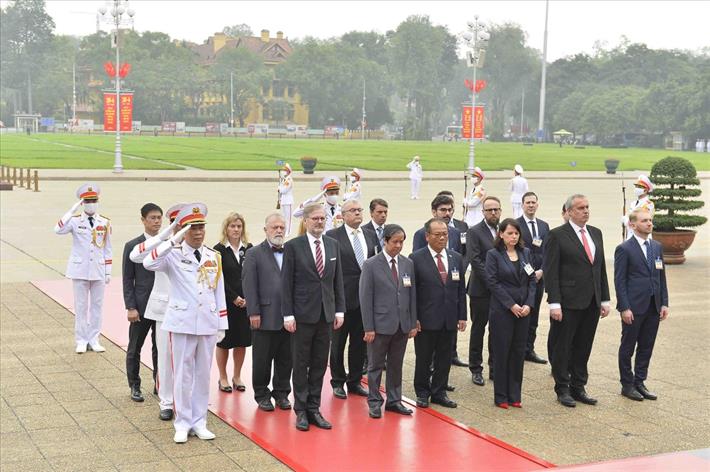 Thủ tướng Cộng hoà Séc Petr Fiala đặt vòng hoa tưởng niệm Chủ tịch Hồ Chí Minh - Ảnh Minh Đức - TTXVN