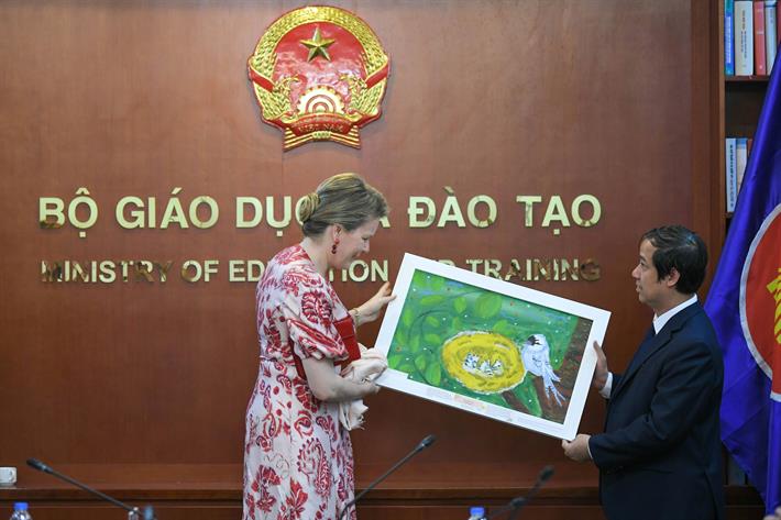 Bộ trưởng Nguyễn Kim Sơn tặng bức tranh của một học sinh có hoàn cảnh đặc biệt của Việt Nam cho Hoàng hậu Vương quốc Bỉ