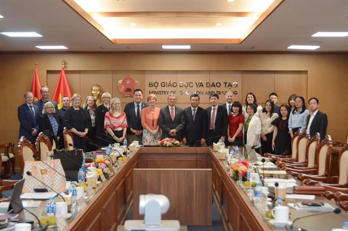 Thứ trưởng Nguyễn Văn Phúc cùng đại diện Bộ GDĐT chụp ảnh lưu niệm với Phái đoàn cấp cao các trường đại học bang Victoria, Australia
