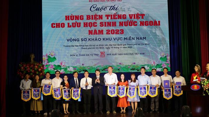 Ban Tổ chức trao cờ lưu niệm cho 13 cở sở giáo dục đại học khu vực phía Nam tham dự vòng sơ khảo