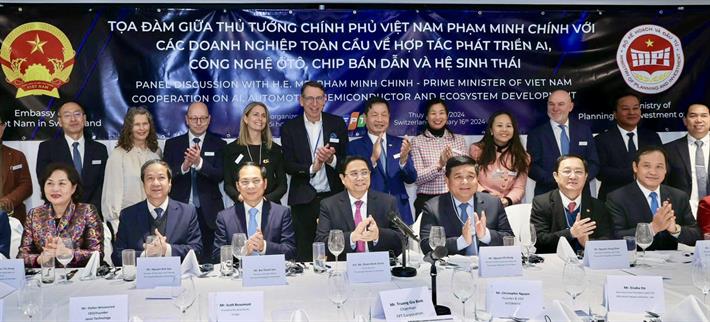 Thủ tướng Phạm Minh Chính và các thành viên Chính phủ tham dự Tọa đàm với các doanh nghiệp toàn cầu về hợp tác phát triển AI, công nghệ ô tô, chíp bán dẫn và hệ sinh thái