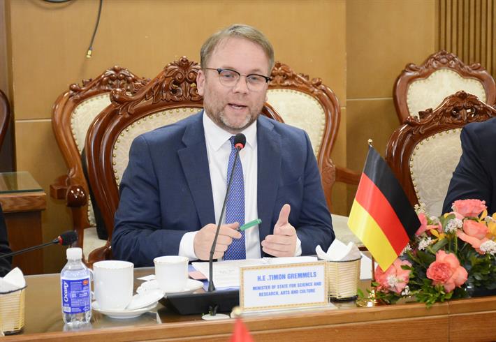 Khẳng định chuyến đi tới Việt Nam lần này của đoàn Bộ Khoa học và Nghiên cứu, Nghệ thuật và Văn hóa bang Hessen rất quan trọng, Bộ trưởng Timon Gremmels chia sẻ vui mừng được đóng góp vào việc thúc đẩy hợp tác giáo dục giữa hai quốc gia.