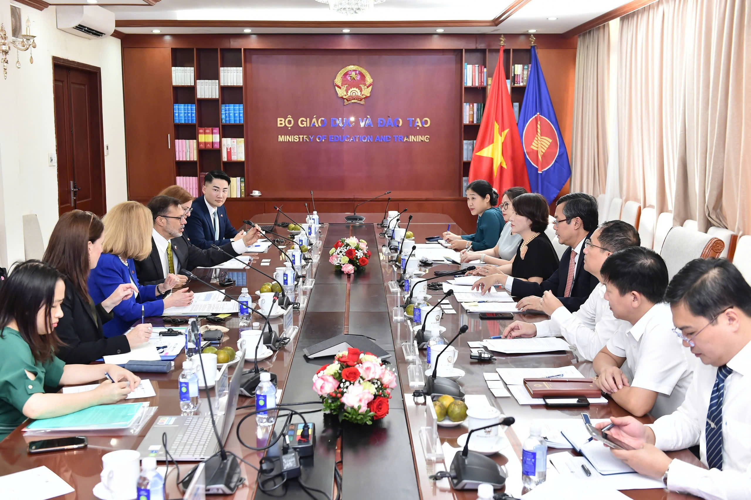 Thứ trưởng đồng tình với quan điểm của Đại sứ, coi giáo dục là trọng tâm của hợp tác và cho biết, Kết luận số 91-KL/TW ngày 12/8/2024 của Bộ Chính trị tiếp tục thực hiện đổi mới căn bản, toàn diện giáo dục và đào tạo nhấn mạnh, khuyến khích các cơ sở giáo dục và đào tạo trong nước liên kết, hợp tác với các cơ sở giáo dục và đào tạo tiên tiến trên thế giới. Xây dựng cơ chế, chính sách đột phá để thu hút, sử dụng chuyên gia, nhà khoa học nước ngoài và người Việt Nam ở nước ngoài về giảng dạy, nghiên cứu và làm việc tại các cơ sở giáo dục và đào tạo trong nước; khuyến khích, thu hút học sinh, sinh viên nước ngoài đến học tập tại Việt Nam. Thu hút các cơ sở giáo dục đại học uy tín trên thế giới mở phân hiệu tại Việt Nam.