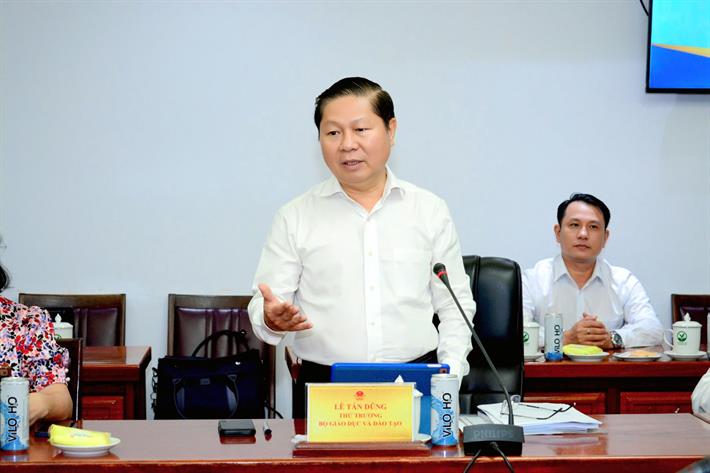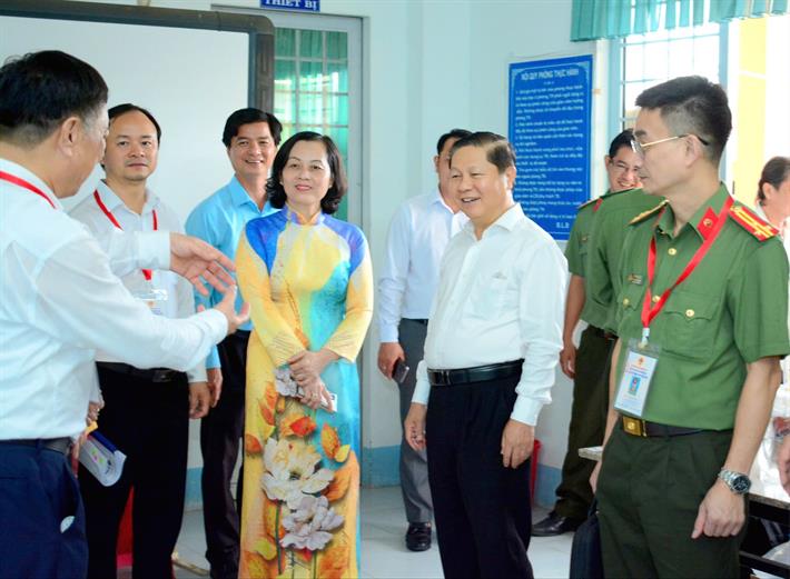 Trong chương trình làm việc, Thứ trưởng Lê Tấn Dũng trực tiếp khảo sát cơ sở vật chất phục vụ kỳ thi, kiểm tra các phòng thi, khu vực làm việc của cán bộ coi thi, đồng thời nắm bắt công tác bảo đảm an ninh, an toàn và phòng, chống gian lận trong thi cử. Trao đổi tại các điểm kiểm tra, Thứ trưởng đánh giá cao sự chuẩn bị chu đáo, nghiêm túc của Ban Chỉ đạo thi tỉnh Vĩnh Long.