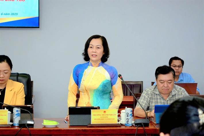 Bà Trương Thanh Nhuận, Giám đốc Sở GDĐT, Phó Trưởng ban Thường trực Ban Chỉ đạo thi tỉnh Vĩnh Long báo cáo tại buổi làm việc