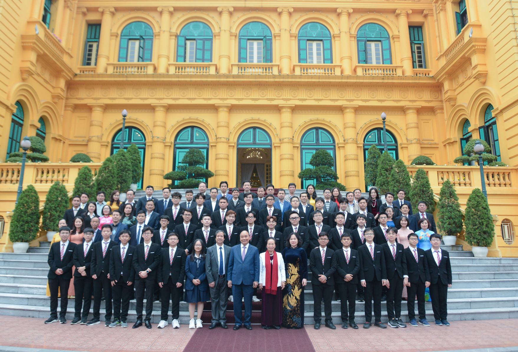 Chia sẻ sự vui mừng được gặp các em học sinh, các thầy cô giáo, Chủ tịch nước Nguyễn Xuân Phúc thay mặt lãnh đạo Đảng, Nhà nước chúc mừng thành công to lớn các em học sinh khi mang vinh quang về cho tổ quốc, cho nhà trường, cho gia đình. Chủ tịch nước khẳng định, thành tích đặc biệt xuất sắc các em có được hôm nay là cả quá trình nỗ lực, phấn đấu của các em, sự dạy dỗ của các thầy cô giáo, công lao của các bậc cha mẹ.