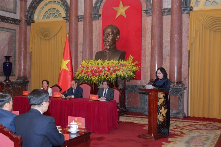 Chủ tịch nước Nguyễn Xuân Phúc và các đại biểu chụp ảnh lưu niệm với các em học sinh tại Phủ Chủ tịch