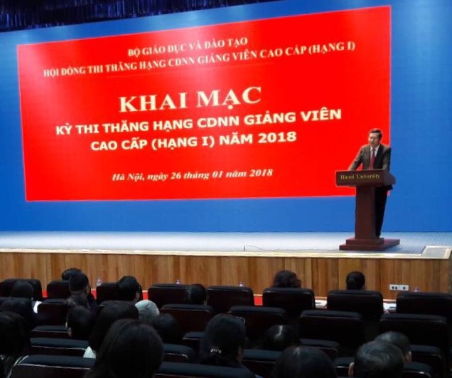 Căn cứ quy định tại Luật Viên chức, Nghị định số 29/2012/NĐ-CP ngày 12/4/2012 của Chính phủ quy định về tuyển dụng, sử dụng và quản lý viên chức; Quyết định số 2893/BNV-CCVC ngày 18/12/2017 của Bộ Nội vụ về việc phê duyệt danh sách đủ điều kiện dự thi thăng hạng CDNN từ giảng viên chính (hạng II) lên giảng viên cao cấp (hạng I) năm 2017 do Bộ Giáo dục và Đào tạo tổ chức, Bộ Giáo dục và Đào tạo đã ban hành Kế hoạch số 18/KH-BGDĐT ngày 16/01/2018 về việc tổ chức thi thăng hạng CDNN giảng viên cao cấp (hạng I). Trường Đại học Hà Nội là đơn vị được Bộ Giáo dục và Đào tạo lựa chọn làm địa điểm để tổ chức kỳ thi này trong các ngày từ 26-28/01/2018.
