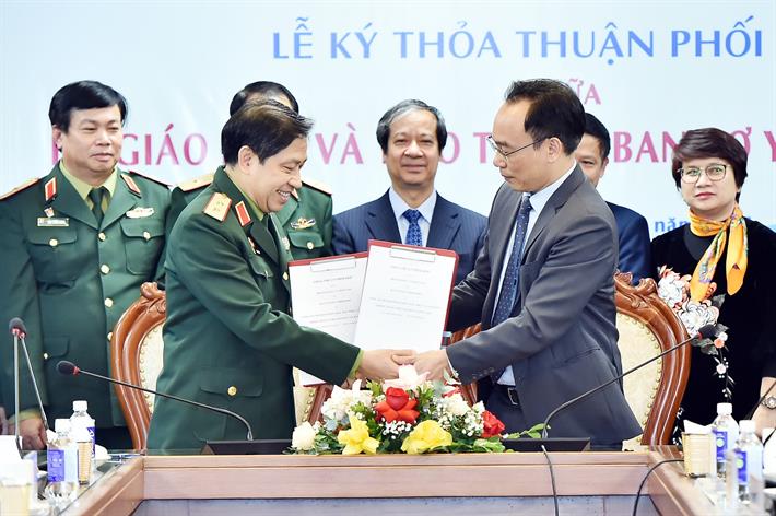 Trung tướng Vũ Ngọc Thiềm - Trưởng ban Cơ yếu Chính phủ và Thứ trưởng Bộ GDĐT Hoàng Minh Sơn ký và trao thoả thuận phối hợp