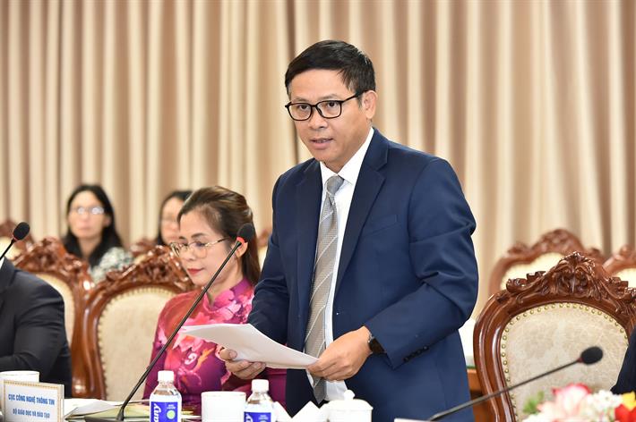 Cục trưởng Cục Công nghệ thông tin (Bộ GDĐT) Nguyễn Sơn Hải trình bày nội dung thoả thuận phối hợp giữa Ban Cơ yếu Chính phủ và Bộ GDĐT
