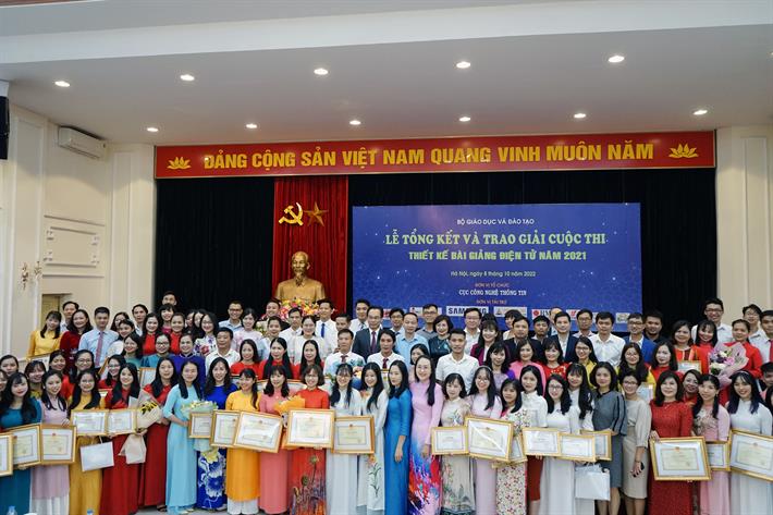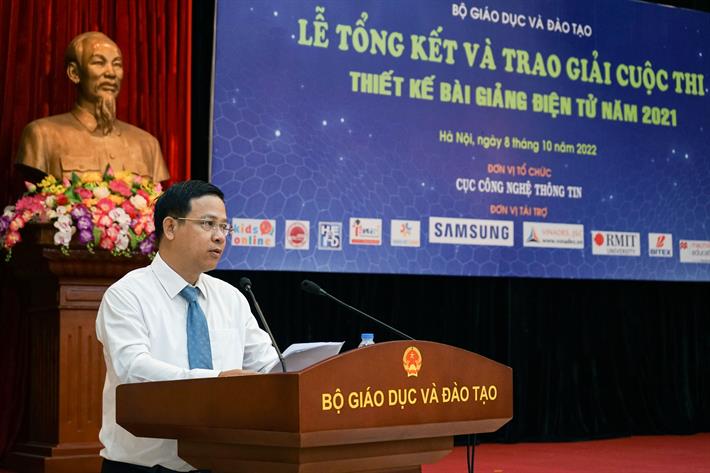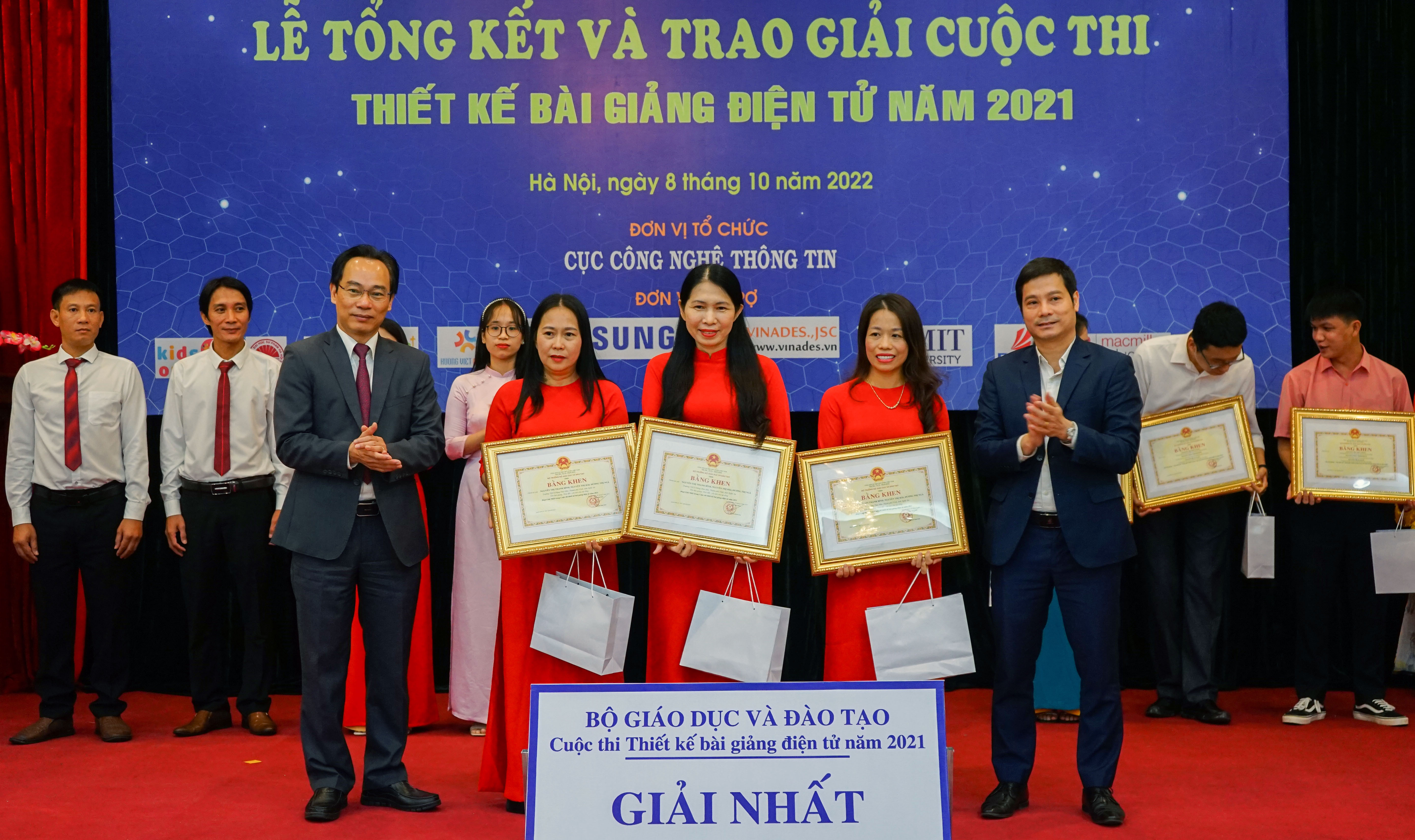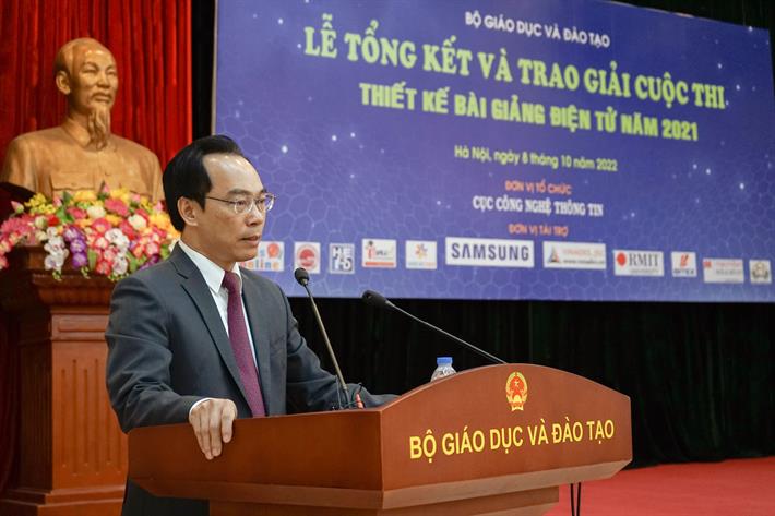 Ngày 8/10, Bộ Giáo dục và Đào tạo (GDĐT) tổ chức lễ tổng kết và trao giải cuộc thi Thiết kế bài giảng điện tử năm 2021. Thứ trưởng Hoàng Minh Sơn dự và phát biểu tại buổi lễ. Cùng dự có đại diện Hệ tri thức Việt số hóa, Công đoàn Giáo dục Việt Nam, lãnh đạo các đơn vị thuộc Bộ GDĐT và các thầy, cô giáo đã có bài dự thi đạt giải.