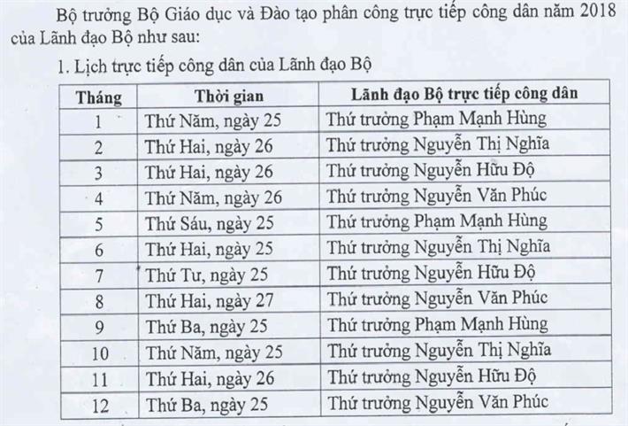 Thứ sáu, 05/10/2018 | 00:00 A- A A+ | Lịch tiếp công dân của Lãnh đạo Bộ Giáo dục và Đào tạo năm 2018 Tập tin đính kèm Xem Theo đề nghị của Chánh Thanh tra, Bộ trưởng Bộ Giáo dục và Đào tạo phân công trực tiếp công dân năm 2018 của Lãnh đạo Bộ như sau: Thông tin chi tiết xem trong file đính kèm./. moet.gov.vn Tài liệu đính kèm 2bfed53ef8fd40222f1cb5d38a408194L%E1%BB%8Bch_ti%E1%BA%BFp_d%C3%A2n_L%C4%90_B%E1%BB%99_2018.PDF Xem trước Tải về Tin cùng chuyên mục Lịch tiếp công dân của Lãnh đạo Bộ Giáo dục và Đào tạo năm 2018 Lịch tiếp công dân của Lãnh đạo Bộ Giáo dục và Đào tạo Tăng cường hoạt động đổi mới thanh tra giáo dục