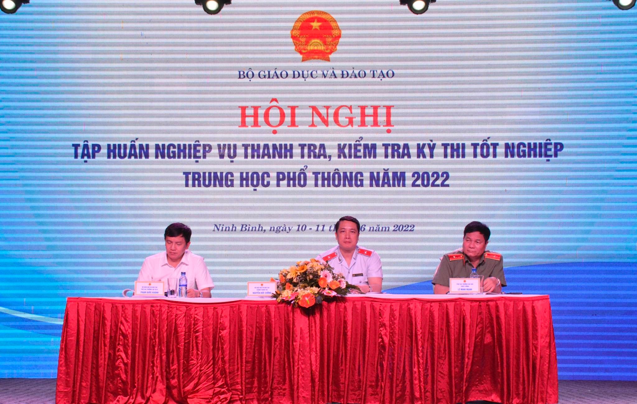 Các nội dung được trao đổi, thảo luận tại Hội nghị tập huấn thanh tra, kiểm tra Kỳ thi tốt nghiệp THPT năm 2022 bao gồm: Hướng dẫn kỹ năng, nghiệp vụ thanh tra, kiểm tra Kỳ thi tốt nghiệp THPT năm 2022; hướng dẫn về Quy chế thi tốt nghiệp THPT năm 2022; hướng dẫn kiểm tra, phát hiện thiết bị công nghệ cao gian lận trong hoạt động thanh tra, kiểm tra Kỳ thi năm 2022; hướng dẫn nghiệp vụ trưởng đoàn thanh tra, kiểm tra Kỳ thi năm 2022; hướng dẫn, kiểm tra, đánh giá kết quả tập huấn.
