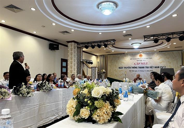Trong không khí trang trọng mà thân tình của buổi gặp mặt, cán bộ cựu Giáo chức Thanh tra Bộ các thời kỳ đã bày tỏ sự xúc động trước tình cảm của những người đang công tác với các thế hệ đi trước; phát biểu chia sẻ và ghi nhận những cố gắng của tập thể Thanh tra Bộ trong việc phát huy truyền thống, phấn đấu hoàn thành xuất sắc nhiệm vụ được giao năm 2021, 2022; đồng thời, bày tỏ mong muốn cơ quan Thanh tra và Chi hội cựu giáo chức Thanh tra Bộ tiếp tục duy trì việc tổ chức gặp mặt Ngày truyền thống hằng năm.