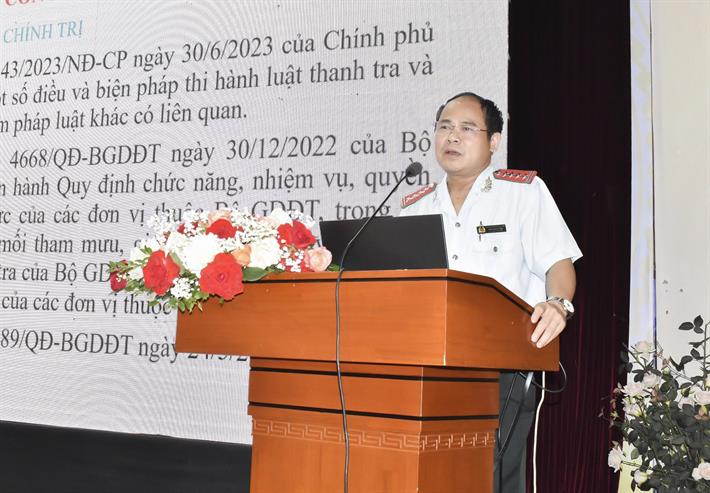 Phó Chánh Thanh tra Bộ GDĐT Ngô Minh Hưng báo cáo tại Hội nghị