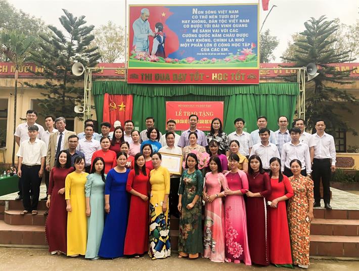 Đại diện Bộ GDĐT, Sở GDĐT tỉnh Thanh Hóa, thầy Đào Thanh Hương và giáo viên Trường Trung học cơ sở Đa Lộc chụp ảnh lưu niệm