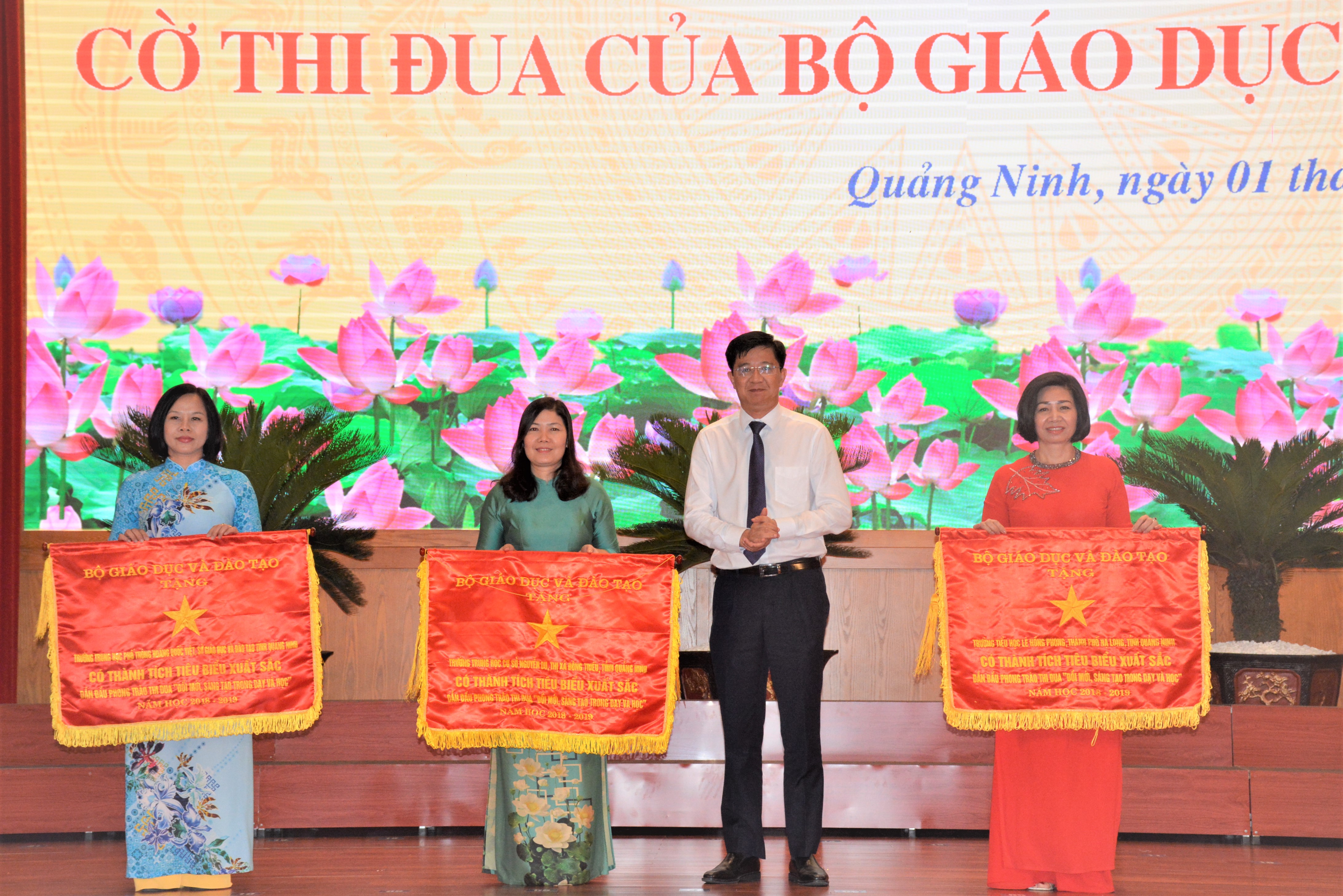 Ông Trịnh Xuân Hiếu, Vụ trưởng Vụ Thi đua - Khen thưởng (Bộ GDĐT) trao cờ thi đua của Bộ GDĐT cho 3 cơ sở giáo dục tiêu biểu của tỉnh Quảng Ninh