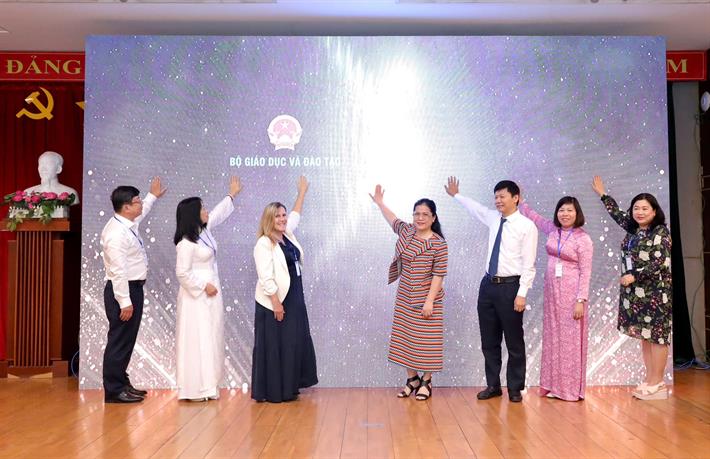 Thứ trưởng Bộ GDĐT Nguyễn Thị Kim Chi, đại diện Vụ GDMN, Tổ chức OneSky, đại diện TP.HCM, Tây Ninh và Bắc Ninh thực hiện nghi thức khởi động dự án