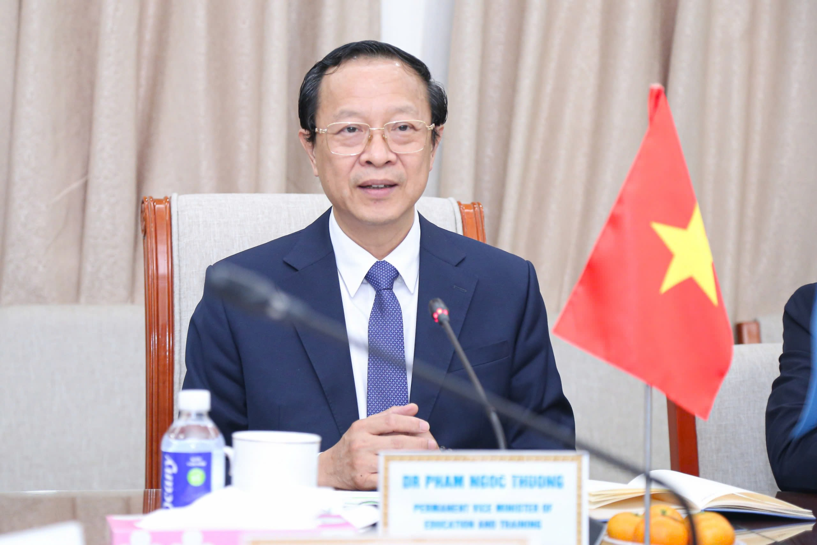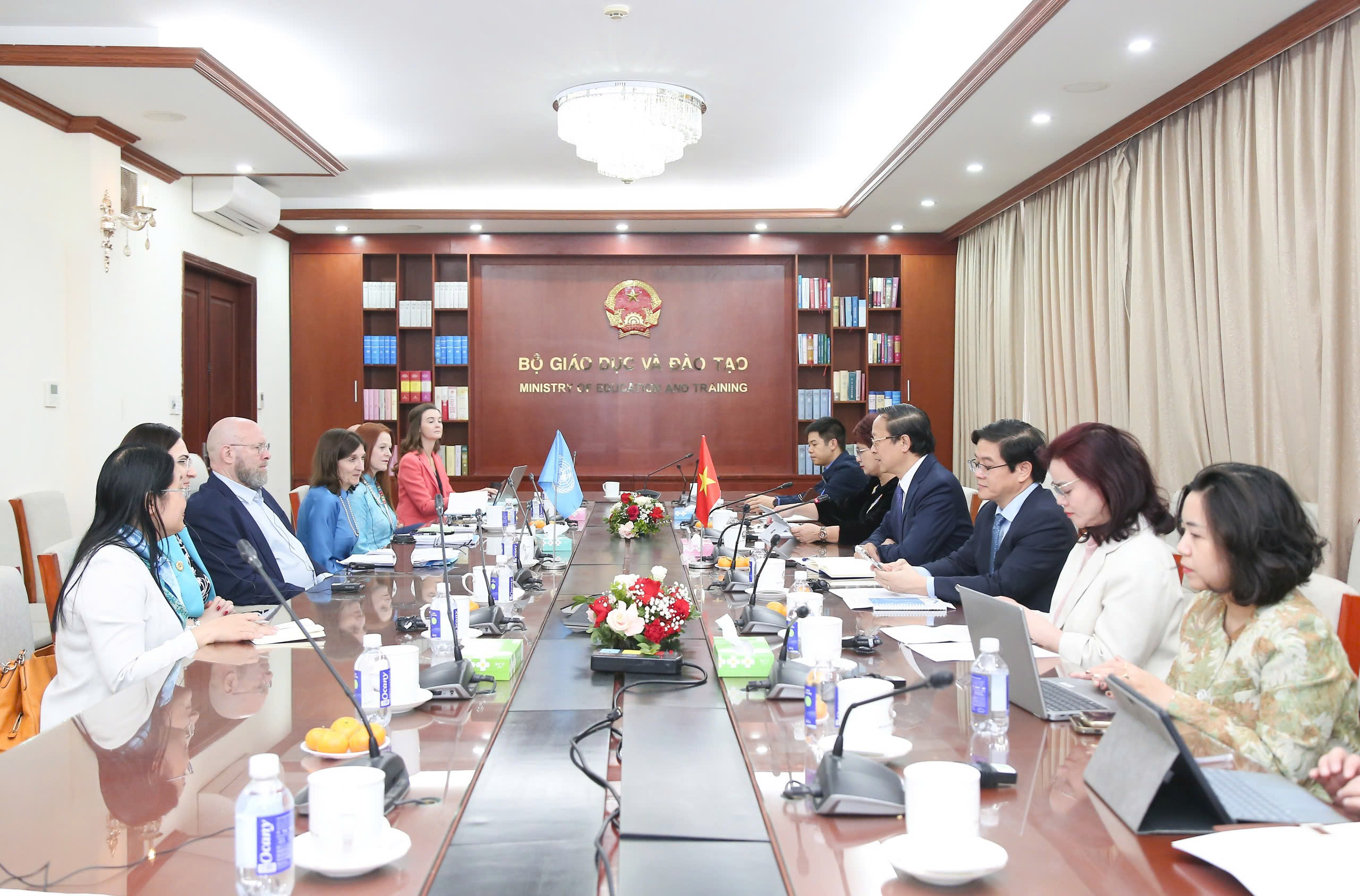 Thứ trưởng Thứ trưởng Thường trực Phạm Ngọc Thưởng đề xuất một số nội dung hợp tác trọng tâm thời gian tới, bao gồm: tăng cường năng lực triển khai Chương trình giáo dục mầm non 2026–2030; thúc đẩy chuyển đổi số, kỹ năng số, AI, kỹ năng xanh và kỹ năng chuyển đổi cho học sinh; thu hẹp chênh lệch tiếp cận giáo dục của trẻ em khuyết tật; mở rộng giáo dục song ngữ dựa trên tiếng mẹ đẻ cho trẻ em dân tộc thiểu số; phát triển các sáng kiến bình đẳng giới và hỗ trợ giáo dục trẻ em gái; tăng cường hệ thống hỗ trợ sức khỏe tâm thần học đường; đảm bảo an toàn internet và phòng chống bạo lực mạng; đồng thời đẩy mạnh mô hình trường học an toàn, ứng phó biến đổi khí hậu và xây dựng lối sống xanh cho học sinh.