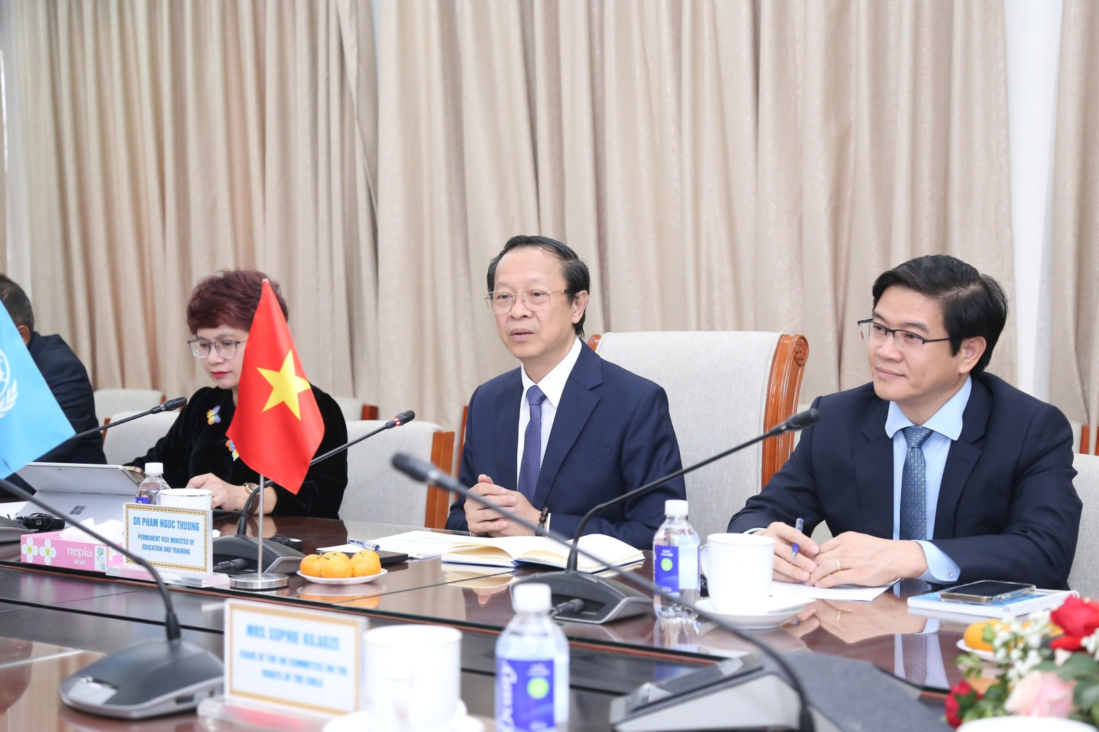 Chiều 26/11, tại trụ sở Bộ Giáo dục và Đào tạo (GDĐT), Thứ trưởng Thường trực Phạm Ngọc Thưởng đã tiếp và làm việc với Chủ tịch Ủy ban Quyền Trẻ em Liên Hợp Quốc Sophie Kiladze, Phó Chủ tịch Ủy ban Philip D. Jaffé, Phó Trưởng Đại diện UNICEF tại Việt Nam Michaela Bauer. Tham dự buổi làm việc có đại diện các đơn vị thuộc Bộ GDĐT và các chuyên gia giáo dục của UNICEF.