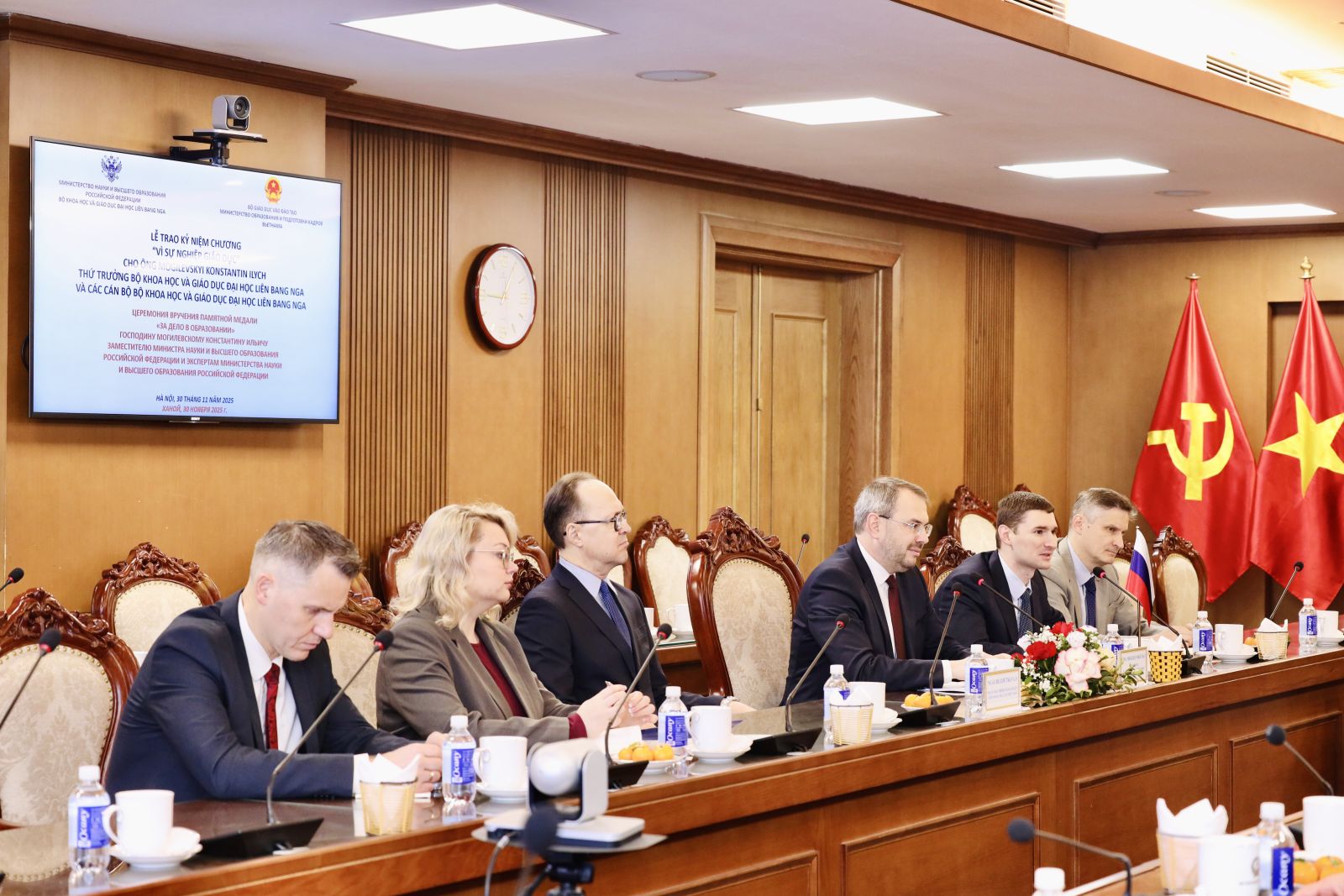 Ông đánh giá cao những bước tiến cụ thể của hai Bộ trong năm 2024–2025, đặc biệt là Hiệp định thành lập Trung tâm tiếng Nga A.X. Pushkin, triển khai hiệu quả các chương trình đào tạo tại Liên bang Nga, thúc đẩy mở rộng mạng lưới hợp tác đại học, và các kế hoạch chuẩn bị cho Năm Giáo dục và Khoa học Việt – Nga 2026.