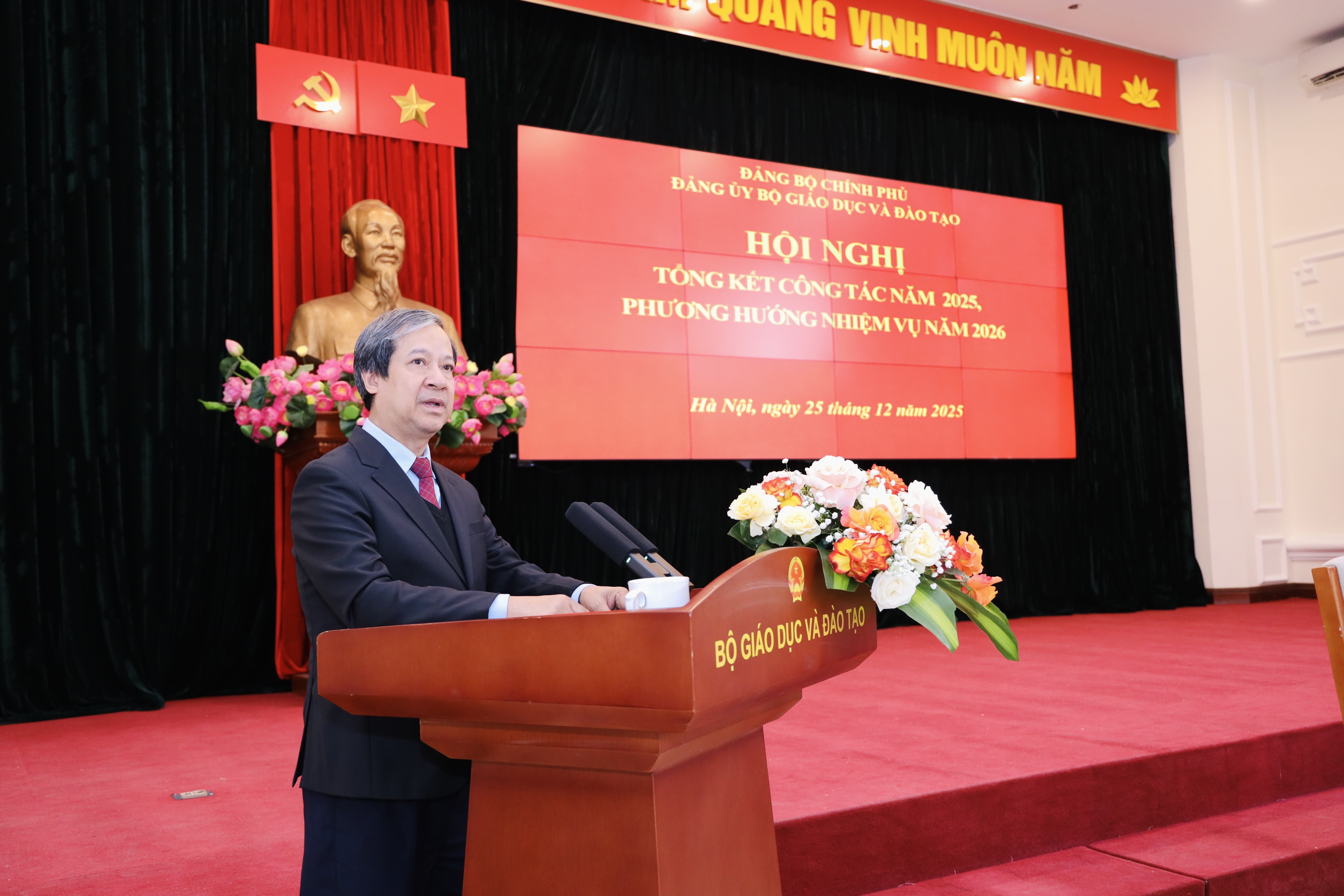 Về phương hướng, nhiệm vụ năm 2026, Bí thư Đảng ủy, Bộ trưởng Bộ GDĐT yêu cầu các cấp ủy tiếp tục bám sát các nghị quyết, kết luận của Trung ương, tập trung nâng cao chất lượng công tác xây dựng Đảng, hoàn thiện thể chế, siết chặt kỷ luật, kỷ cương, tăng cường kiểm tra, giám sát, phòng chống tham nhũng, tiêu cực; đồng thời phát huy mạnh mẽ vai trò nêu gương của cán bộ, đảng viên, tạo động lực mới để toàn Đảng bộ hoàn thành tốt các nhiệm vụ chính trị trong giai đoạn 2026 và những năm tiếp theo.