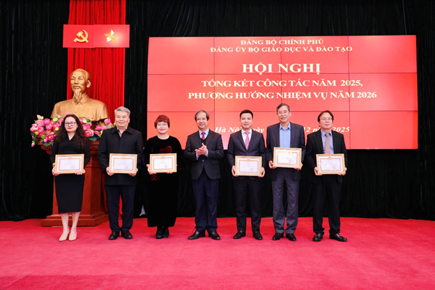 Cùng dịp này, Đảng ủy Bộ GDĐT khen thưởng 5 tập thể “Hoàn thành xuất sắc nhiệm vụ” tiêu biểu năm 2025, 1 tập thể hoàn thành xuất sắc nhiệm vụ 5 năm liên tục (2021–2025).