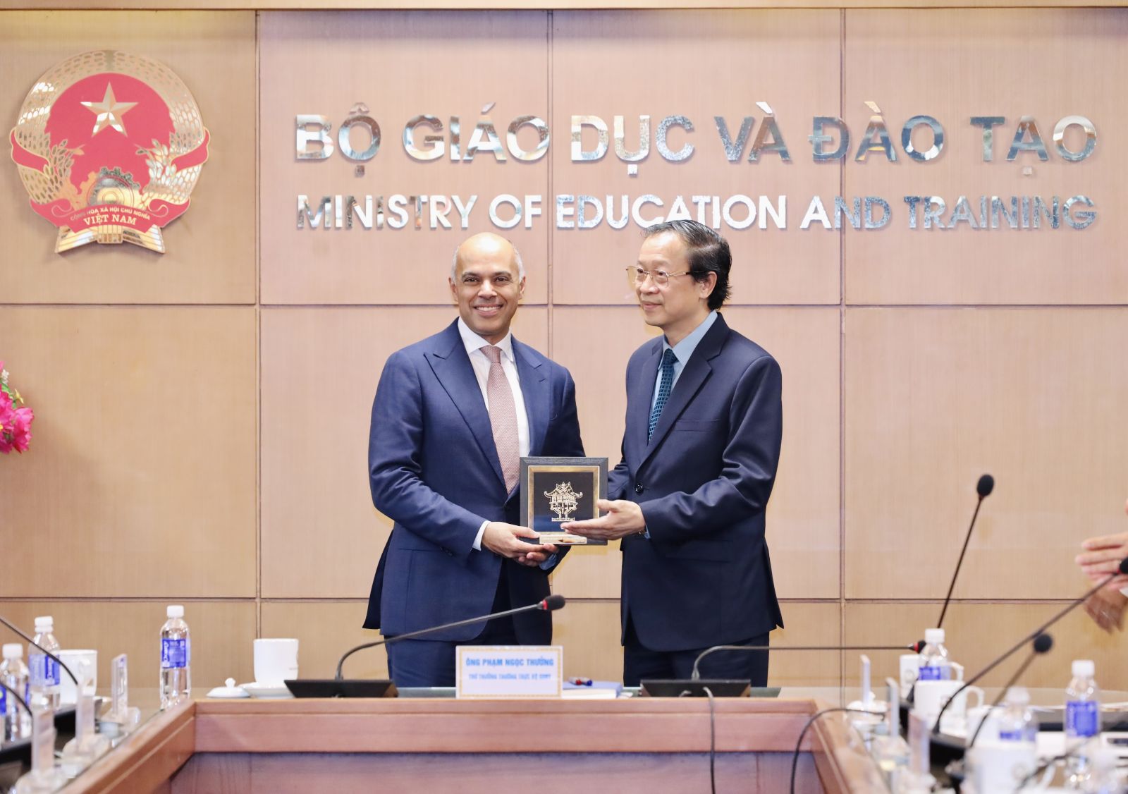 Thứ trưởng Thường trực Phạm Ngọc Thưởng và ông Amit Sevak, Tổng Giám đốc, Viện Khảo thí Giáo dục Hoa Kì (ETS) trao quà lưu niệm