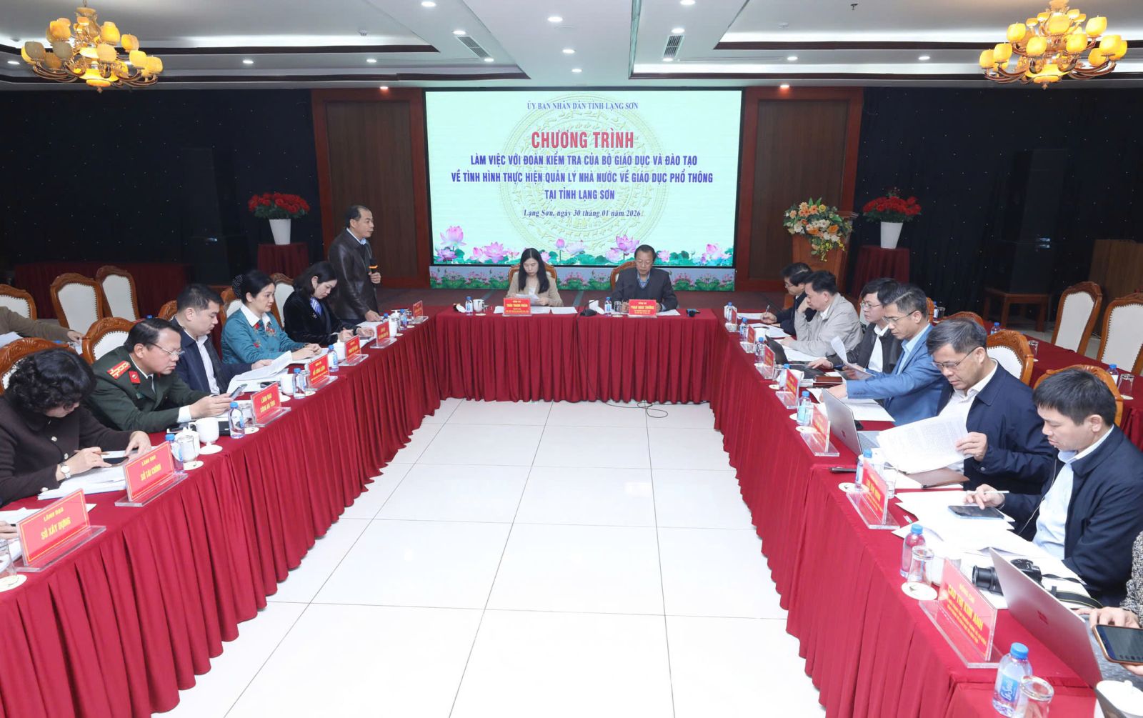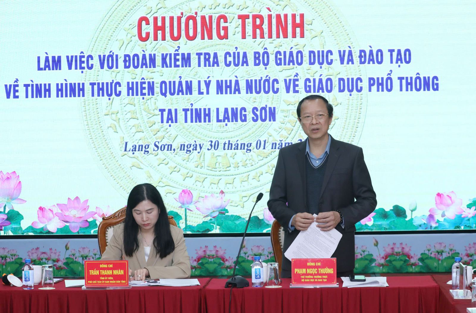 Ngày 30/1, Thứ trưởng Thường trực Phạm Ngọc Thưởng và thành viên đoàn công tác Bộ Giáo dục và Đào tạo (GDĐT) đã có buổi làm việc với tỉnh Lạng Sơn về tình hình thực hiện quản lí nhà nước về giáo dục phổ thông trên địa bàn.