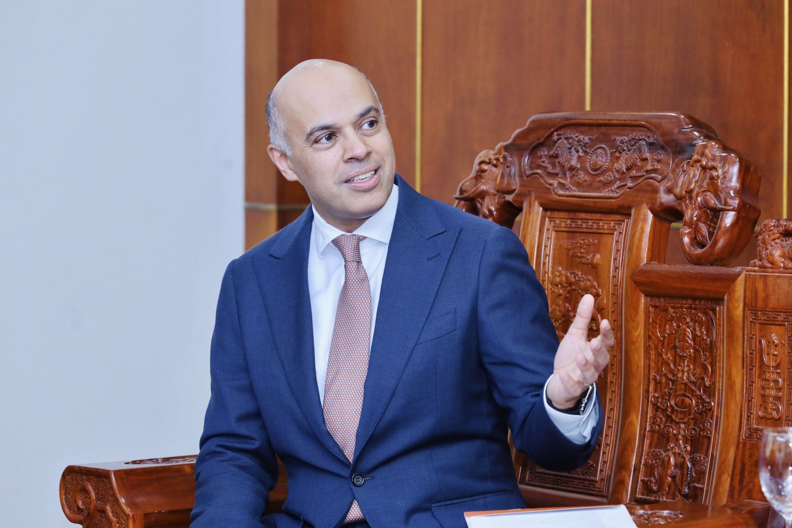 Quyền Bộ trưởng Hoàng Minh Sơn và Tổng Giám đốc Viện Khảo thí Giáo dục Hoa Kỳ Amit Sevak trao đổi tại buổi làm việc