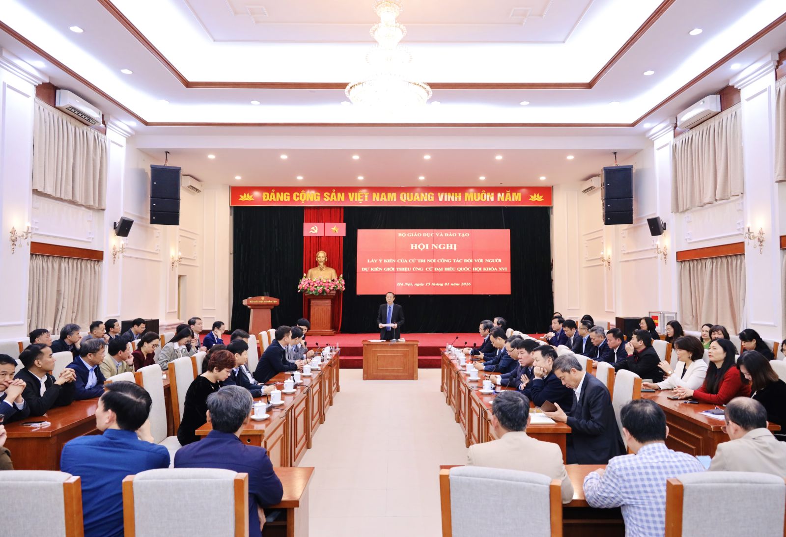 Ngày 15/1, Bộ Giáo dục và Đào tạo (GDĐT) tổ chức hội nghị lấy ý kiến của cử tri nơi công tác đối với người dự kiến giới thiệu ứng cử đại biểu Quốc hội khóa XVI đối với đồng chí Nguyễn Kim Sơn, Ủy viên Trung ương Đảng, Bí thư Đảng ủy, Bộ trưởng Bộ GDĐT, đại biểu Quốc hội khóa XV, người được giới thiệu ứng cử đại biểu Quốc hội khóa XVI, nhiệm kỳ 2026-2031.