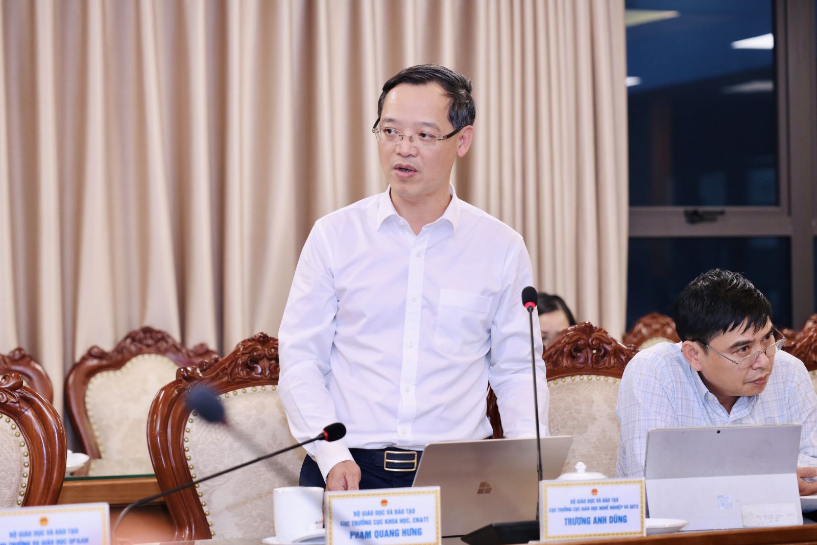 Cục trưởng Cục Giáo dục nghề nghiệp và Giáo dục thường xuyên Trương Anh Dũng báo cáo tại phiên họp