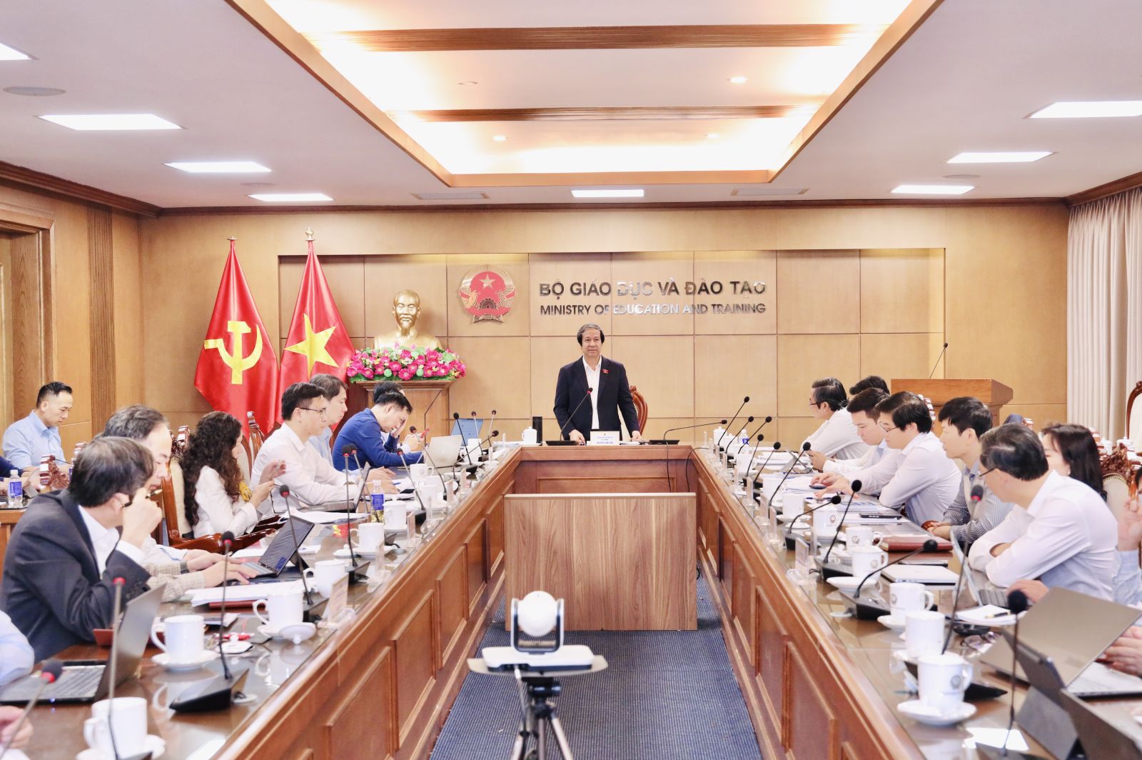 Phát biểu chỉ đạo tại phiên họp, Bộ trưởng Bộ GDĐT Nguyễn Kim Sơn lưu ý với các đơn vị: đây là mảng công việc đang được các cấp, ngành quan tâm nhất, với số lượng việc nhiều. Do đó cần phải chú trọng, quan tâm đến yêu cầu về thời gian, tiến độ rất cao. “Đây là yêu cầu rất ráo riết, đúng tiến độ và không sót việc”, Bộ trưởng nhấn mạnh.