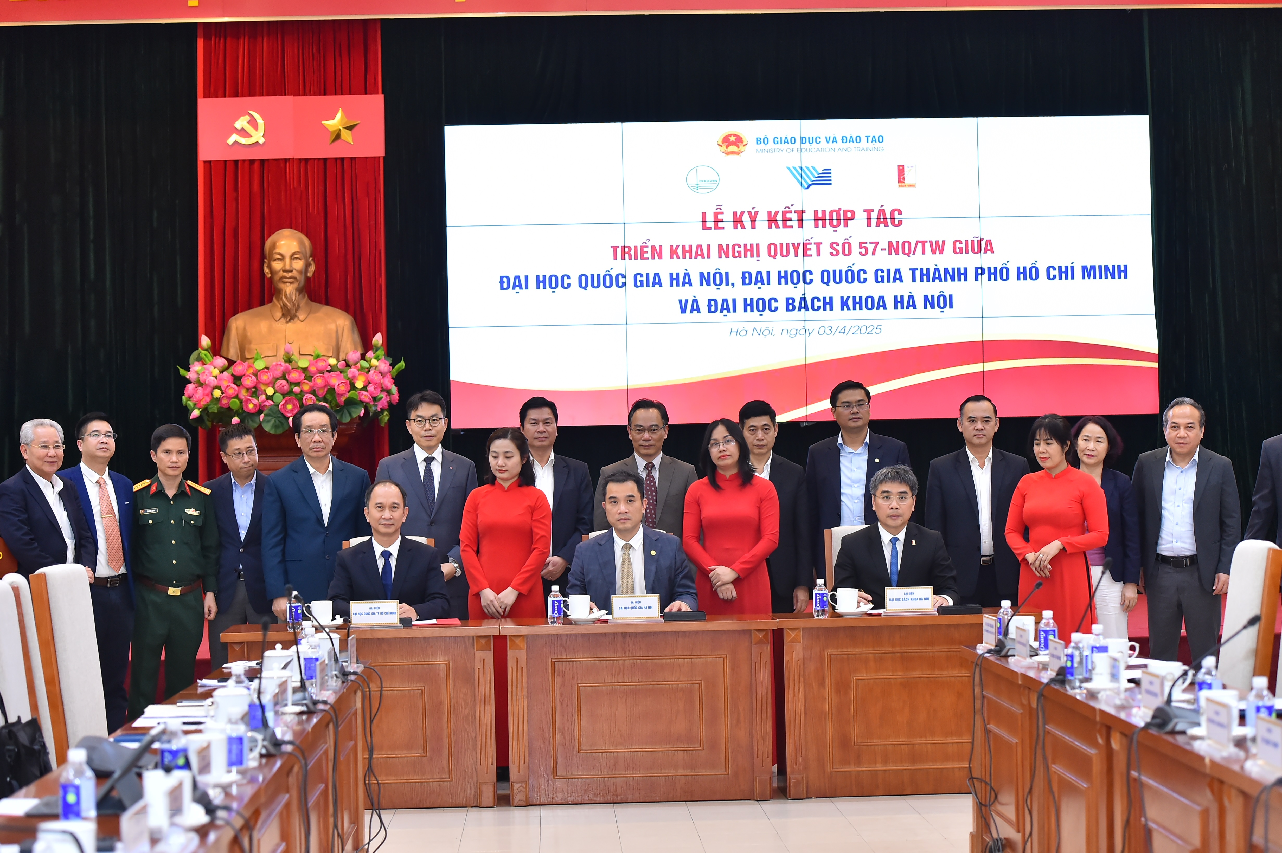 Ngày 3/4, tại Bộ Giáo dục và Đào tạo (GDĐT) đã diễn ra lễ ký kết hợp tác triển khai Nghị quyết 57-NQ/TW của Bộ Chính trị về đột phá phát triển khoa học, công nghệ, đổi mới sáng tạo và chuyển đổi số quốc gia giữa Đại học Quốc gia Hà Nội, Đại học Quốc gia TP Hồ Chí Minh và Đại học Bách Khoa Hà Nội. Thứ trưởng Bộ GDĐT Hoàng Minh Sơn dự và phát biểu tại buổi lễ.