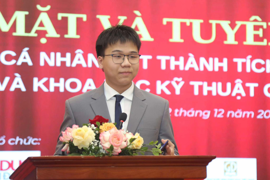 Đại diện học sinh dự thi Olympic quốc tế, em Ngô Quang Minh - Huy chương Vàng Olympic Hóa học quốc tế, Trường THPT Chuyên Bắc Ninh, gửi lời cảm ơn tới thầy cô, gia đình và khẳng định thành tích đạt được mới chỉ là điểm khởi đầu. Minh bày tỏ mong muốn tiếp tục được học tập, giao lưu quốc tế và mang những tri thức mới đóng góp cho sự phát triển của đất nước.