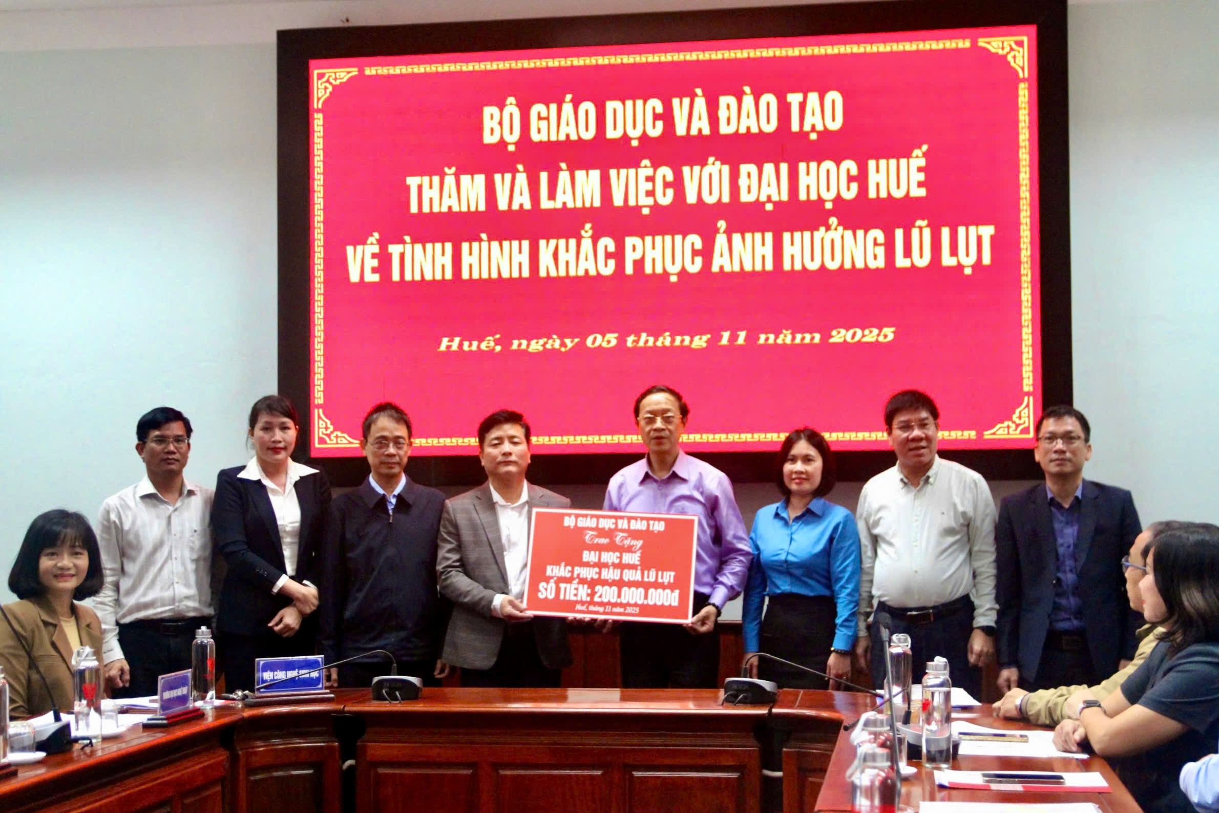 Dịp này, đoàn công tác của Bộ GDĐT đã trao hỗ trợ số tiền 650 triệu đồng cho ngành Giáo dục thành phố Huế, 100 triệu cho Trường Tiểu học Thuỷ Vân, 200 triệu cho Đại học Huế, 15 triệu đồng cho gia đình có học sinh thiệt mạng do mưa lũ. Thông qua đoàn công tác của Bộ GDĐT, Hội đồng Giáo sư Nhà nước hỗ trợ toàn bộ sách giáo khoa của học sinh thành phố Huế bị thiệt hại.